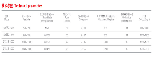 DYSSG系列撕碎機可用于直徑1200MM的PE,PP,PVC管材撕碎,長度達3-6M的管材直接破碎,無需分割,其轉(zhuǎn)速緩慢運轉(zhuǎn)平穩(wěn),各種管材放入水平的喂料槽中,喂料槽自動關(guān)閉由液壓推進將管材推向軸中心進行破碎。撕碎機破碎后的材料通過輸送機帶入二次破碎完成需要的破碎顆粒直徑。