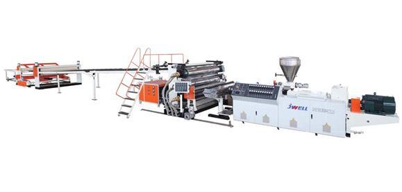 生產線由專用的錐形雙螺桿擠出機、板材模具和三輥成型機等輔機組成。